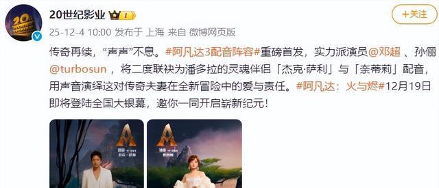 12月4日,@20世纪影业 官宣《阿凡达3》配音:传奇再续,“声声”不息。演员邓超、孙俪将二度联袂为潘多拉的灵魂伴侣“杰克·萨利”与“奈蒂莉”配音云谷策略,用声音演绎这对传奇夫妻在全新冒险中的爱与责任。