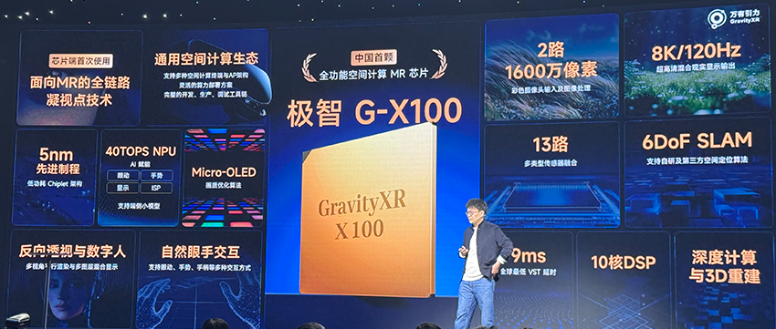 芯东西11月27日报道,今日,宁波空间计算新锐企业万有引力(GravityXR)公司推出中国首颗全功能空间计算MR(混合现实)专用芯片“极智G-X100”等三款产品,以及面向生态伙伴的空间计算全栈解决方案。
