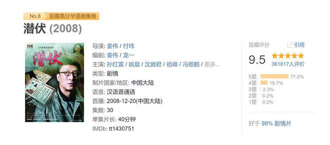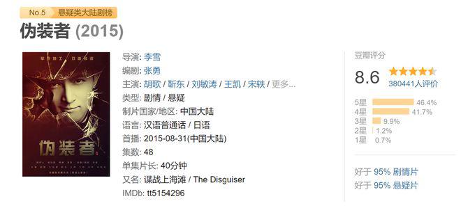 再将时间往前推 10 年,能够作为代表的有 2 部,一部是 2017 年的《风筝》,一部是 2015 年的《伪装者》丰益国际,这两部豆瓣评分都在 8.5 以上。